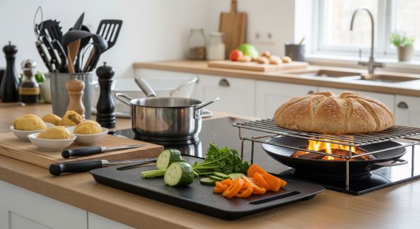 - Préranger les outils : Sur chaque poste, placez à portée de main couteaux, planches, saladiers, cuillères, torchons propres, poubelles de table (ou sacs compost) pour éviter les déplacements inutiles.