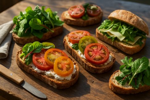- Proposez du pain (complet ou sans gluten), du fromage frais ou tartinable, et laissez les enfants décorer avec des radis détaillés (petites fleurs, cœurs), brins de ciboulette, pousses d’épinards.