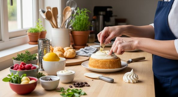 - Plan de travail : Ustensiles rangés dans des pots. Plateau “desserts” distinct avec moules, poches à douille, et décorations comestibles.