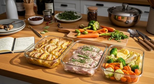Optimisez l’utilisation de votre four, votre robot ou vos casseroles : lancez ce qui prend le plus de temps au début (légumineuses, gratins) puis les cuissons rapides (légumes vapeurs, omelettes, sauces express). - Assemblage et conservation